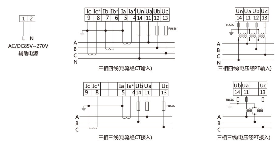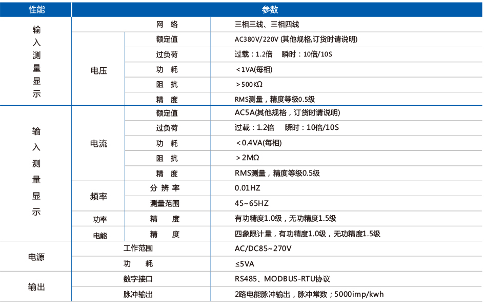 Measurement: three-phase phase voltage, line voltage, current, total active power, total reactive power, total power factor, total apparent power, active energy, and reactive energy.